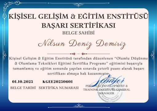 Kişisel Gelişim & Eğitim Enstitüsü Olumlu Düşünme & Olumlama Teknikleri Eğitimi Sertifika Programının tamamlanması ile: