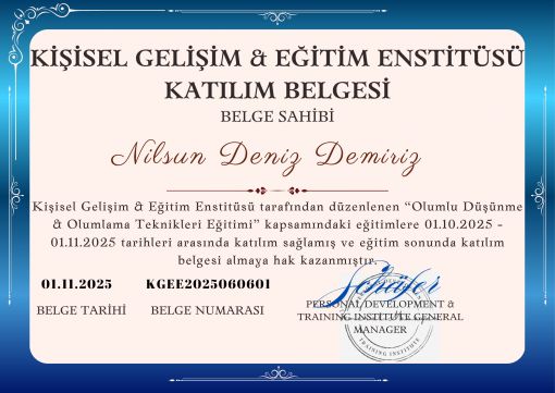 Kişisel Gelişim & Eğitim Enstitüsü Olumlu Düşünme & Olumlama Teknikleri Eğitimi Katılım Belgesi (PDF Formatı)
