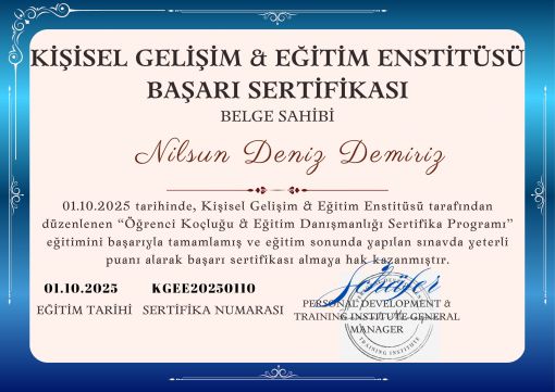 Kişisel Gelişim & Eğitim Enstitüsü Öğrenci Koçluğu & Eğitim Danışmanlığı Sertifika Programının tamamlanması ile: