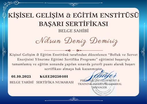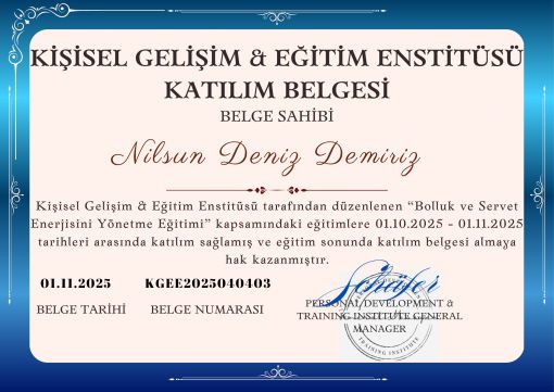 | Kişisel Gelişim & Eğitim Enstitüsü Bolluk ve Servet Enerjisini Yönetme Eğitimi Katılım Belgesi (PDF Formatı) |